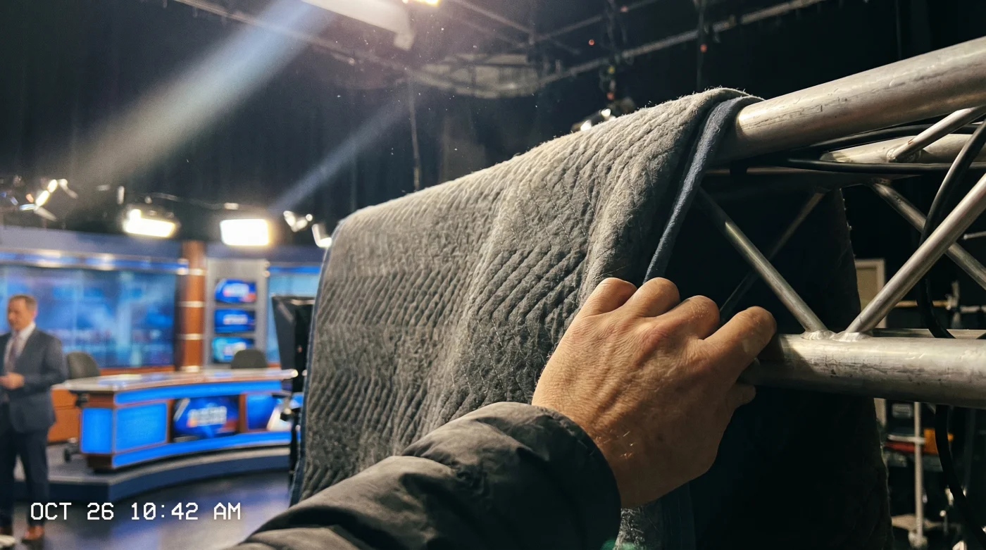 El lente de la cámara nunca enfoca las gruesas telas oscuras que caen desde el techo, abrazando los bordes del set de Noticias Caracol. Es un choque visual absoluto: cámaras de última generación conviviendo con una solución textil que tu abuela entendería perfectamente. Ese contraste guarda la respuesta a uno de los problemas más frustrantes de la producción visual diaria.