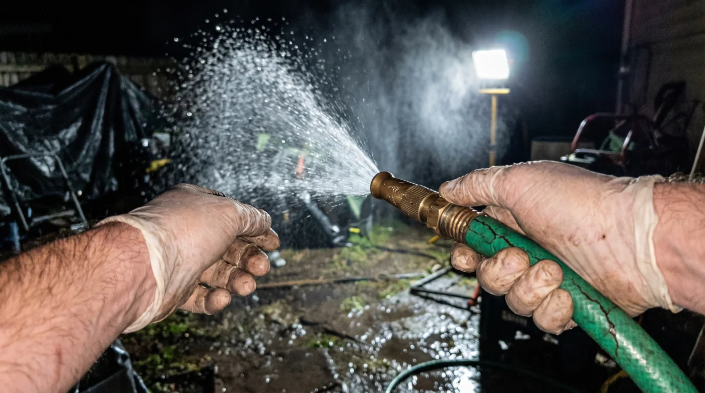 Por otro lado, cuando la narrativa exige un clímax desesperado, un momento de furia implacable o una gran revelación, la técnica del operador se vuelve muchísimo más visceral, ruda e inmediata. Se retira por completo la boquilla dispersora refinada y el viejo truco del pulgar firmemente presionado sobre la salida desnuda del tubo de goma toma el protagonismo absoluto. Esta obstrucción intencional fuerza al líquido a estallar a alta presión y chocar violentamente contra objetos interpuestos, como la lona de reflectores oscuros o gruesas ramas de árboles cercanos, antes de encontrar finalmente a los personajes en forma de un caos líquido.