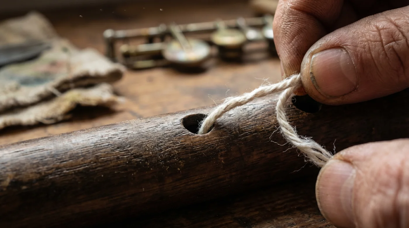 Para el purista de la tradición: Si tocas una flauta de millo artesanal, gaitas colombianas o quenas de madera porosa, el material orgánico requiere un tacto profundamente respetuoso. Un hilo de coser normal no hará contacto suficiente con las paredes, y uno de poliéster dejará pelusas atrapadas en las astillas microscópicas. Busca un cordón de algodón crudo trenzado de al menos tres milímetros de grosor, de esos que compras por apenas 2.000 COP el metro en cualquier mercería tradicional de barrio.