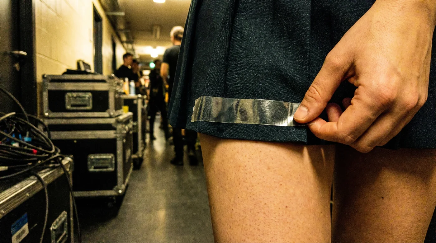 Pero la realidad profesional es mucho más fría y calculada. La seguridad absoluta no viene de costuras mágicas ni de telas experimentales, sino de un pequeño rollo adhesivo que se esconde a plena vista. Un truco crudo, casi industrial, que separa a la aficionada preocupada de la estrella que domina el escenario.