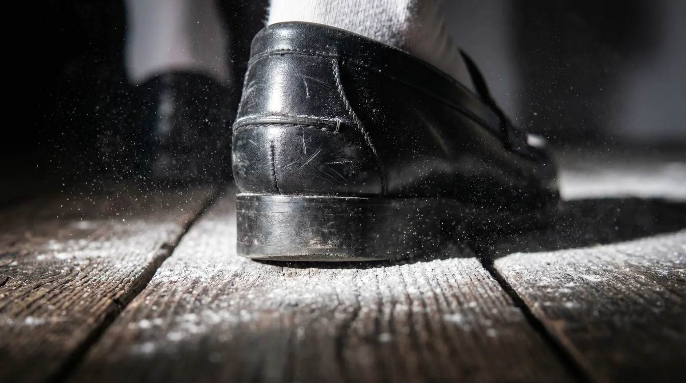 Para el purista de madera: Las duelas barnizadas ya tienen un margen de deslizamiento natural. Aquí, menos es más. Una ligera palmada de polvo en la yema de los dedos, transferida exclusivamente al centro del metatarso del zapato, es más que suficiente. Si rocías directamente sobre el suelo, crearás una pista de hielo peligrosa para cualquiera que pase después.