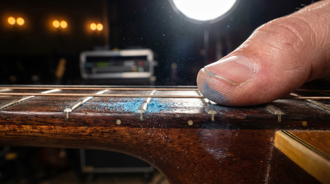 Tu técnica debe ser casi invisible. Solo una huella dactilar de polvo es suficiente. Toca suavemente el cubo de tiza con la yema del dedo índice y frótalo contra el pulgar hasta que desaparezca el color, dejando solo la textura. Esto te dará el control absoluto sobre el mástil sin añadir ruidos ásperos que arruinen una mezcla limpia de audio.