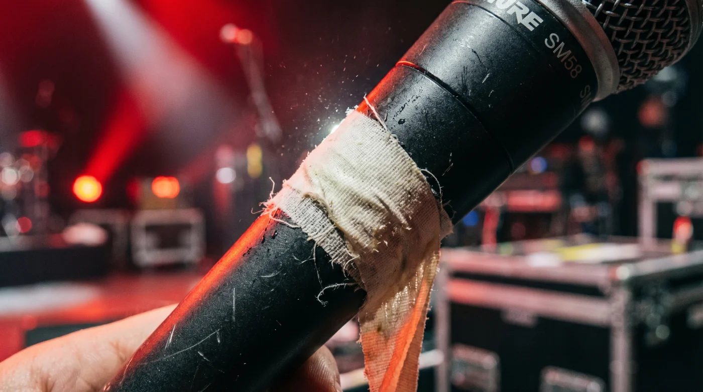 Es una paradoja técnica fascinante. Tienes un micrófono dinámico calibrado milimétricamente, capaz de capturar la respiración más leve entre frases verbales, envuelto burdamente en cinta de tela blanca.