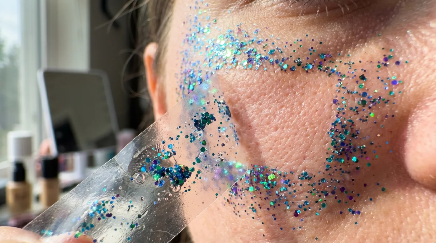 La luz de la mañana entra por la ventana y te enfrentas al espejo tras una noche de celebración intensa. Tu rostro aún conserva los rastros de esa creatividad festiva: pequeñas partículas brillantes adheridas firmemente a tus pómulos y párpados. La primera reacción dictada por el instinto es tomar agua micelar, empapar un algodón y comenzar a frotar con la esperanza de borrar el rastro de la fiesta.