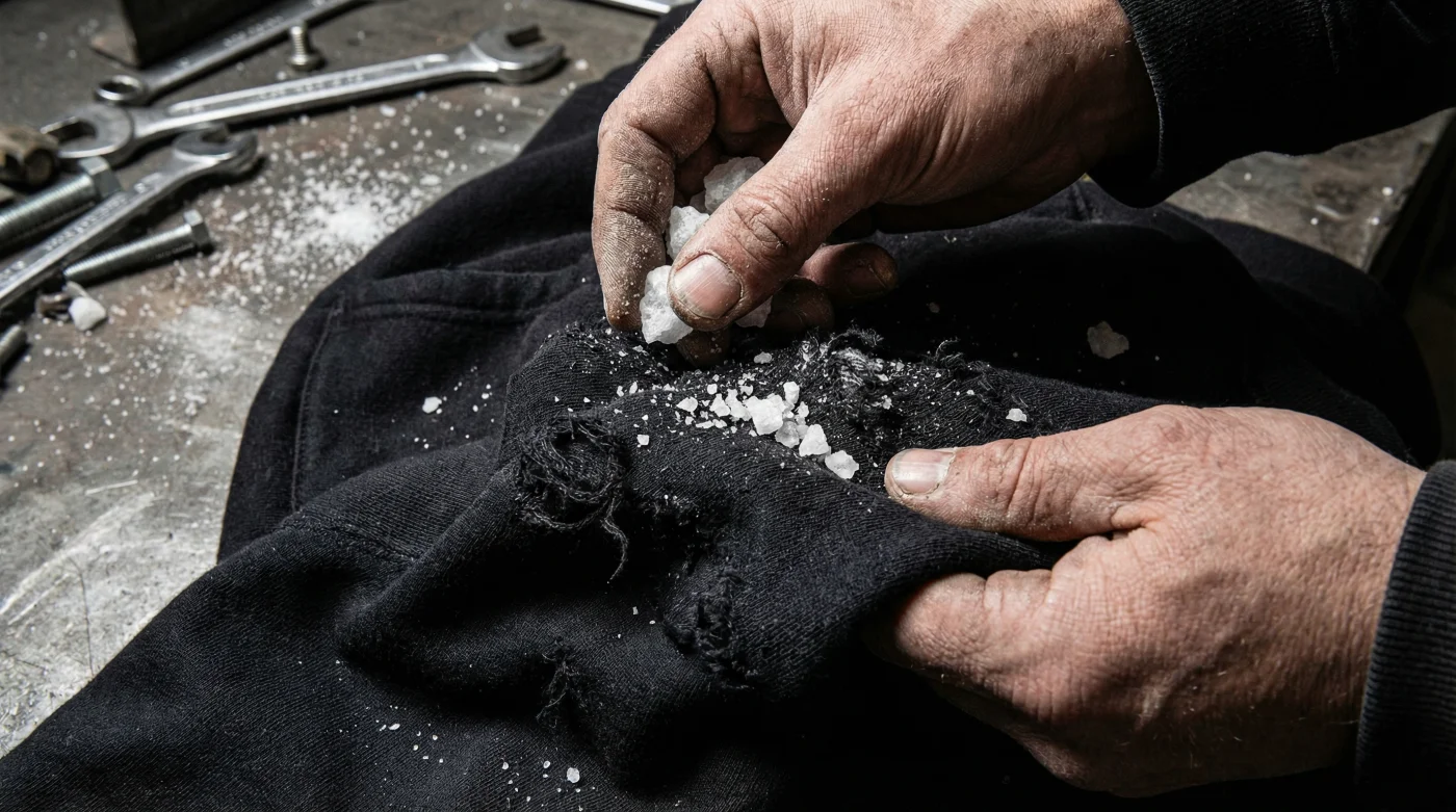 Todo cambió una noche cuando, navegando por foros especializados en conservación textil, Mateo decidió comprar un gran bulto de cincuenta kilos de sal marina gruesa sin refinar, directamente en la Plaza Minorista. Mezcló grandes cantidades de esta sal con un volumen mínimo de agua hirviendo y dejó que el motor de su lavadora industrial golpeara sin compasión una tanda de buzos pesados. El resultado frente a sus ojos fue inmediato y revelador: los gruesos bordes se deshilacharon con una naturalidad asombrosa y el negro intenso mutó en un gris ceniza increíble. Había condensado diez años de uso en cuarenta minutos.