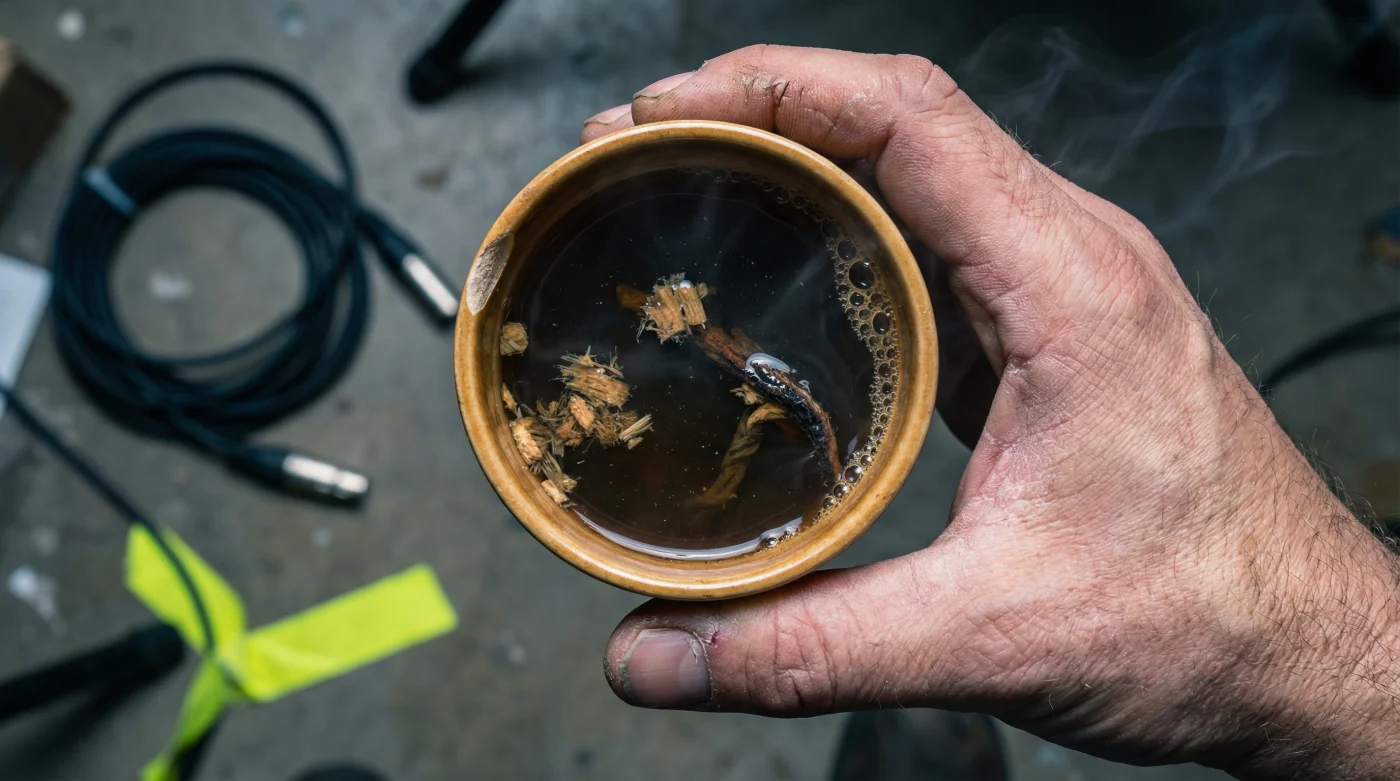Da un sorbo lento y no pestañea. No es una infusión relajante de manzanilla ni un té verde lleno de antioxidantes. Es un líquido oscuro, áspero, que raspa ligeramente la garganta y deja la lengua áspera como papel de lija. La magia de su famosa inexpresividad no nace de una apatía innata frente a la cámara, sino de una fricción física deliberada que adormece los reflejos naturales de sus músculos faciales.