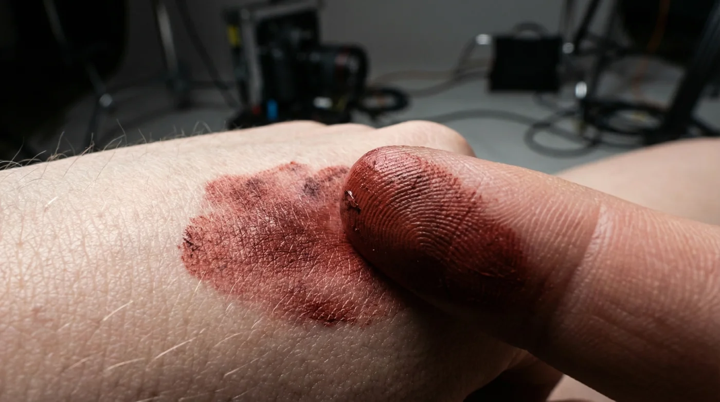 Para el espectador detallista: La credibilidad reside enteramente en las fronteras de la mancha. Ningún hematoma biológico tiene un perímetro limpio. Emplea un hisopo de algodón apenas humedecido con tu crema hidratante diaria para borrar los límites del color, forzando a que el labial se difumine como si respirara a través de una almohada sobre la piel intacta.