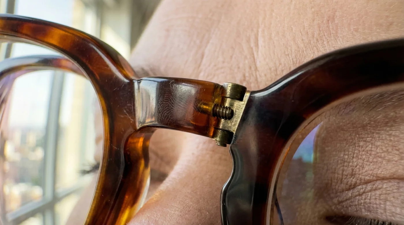 El carey, con sus manchas ambarinas, marrones y negras, crea un punto focal dinámico. Cuando te pones unas gafas de marco grueso, la línea inferior del armazón cae estratégicamente justo sobre o ligeramente por debajo del surco de la ojera, proyectando una sombra natural que camufla el agotamiento.