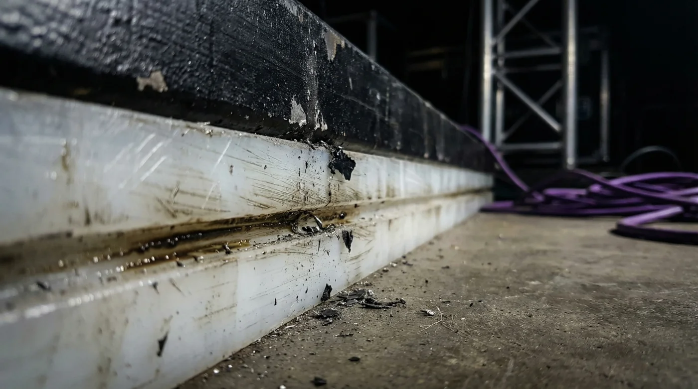 Para el recinto cerrado: En lugares como el Movistar Arena, donde el suelo de concreto pulido ya ofrece una buena base, el riesgo no es hundirse, sino dañar la superficie. Las láminas de teflón se colocan sobre raíles de aluminio milimétricos. El equipo técnico solo necesita empujar suavemente desde la base para que bloques de luces de dos toneladas se reubiquen sin dejar un solo rasguño en el piso.