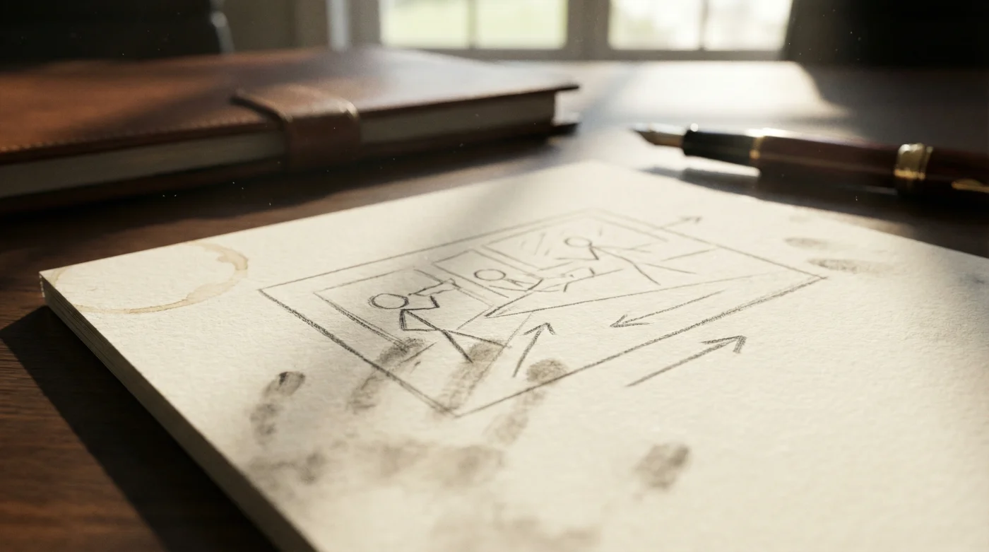 Sin embargo, piensa en tu proyecto como el esqueleto de un edificio de conservación. Si los cimientos están chuecos, ningún papel tapiz de diseñador evitará que se derrumbe. Presentar bocetos a mano desnuda tu idea y bloquea las objeciones superficiales, forzando al espectador a evaluar únicamente si la historia respira por sí misma.
