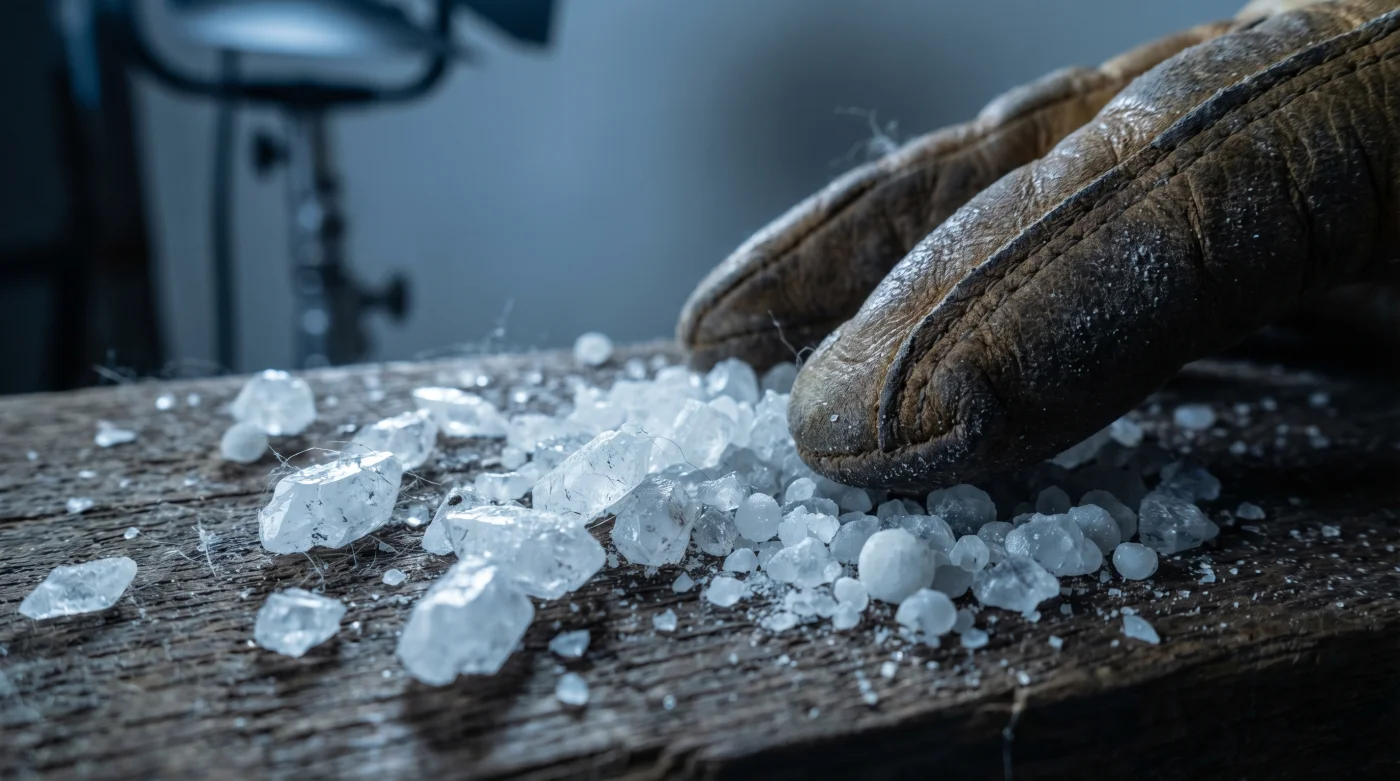 Para la escarcha de primer plano, reinan las sales de Epsom, también conocidas como sulfato de magnesio. Cuando se disuelven en agua tibia y se rocían sobre una superficie oscura, cristalizan lentamente al secarse. Este es el efecto que ves en las capas de los actores o en el borde de una espada. Es una capa frágil, capta la luz de la cámara con destellos microscópicos y, si el actor lo toca, se rompe con una naturalidad que engaña a cualquier lente.