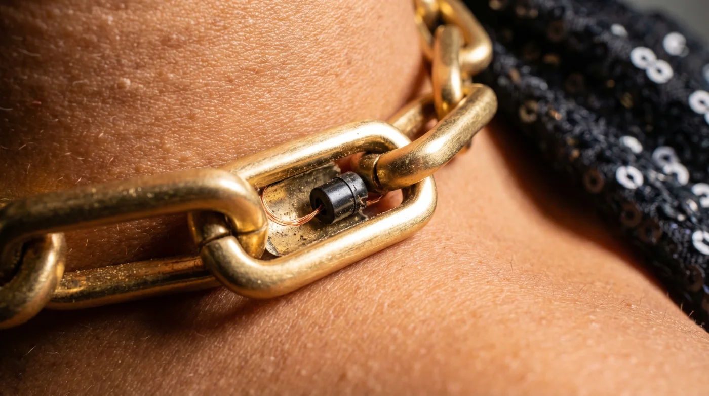 La televisión moderna ha abandonado la tortura del cableado corporal. El secreto para capturar cada susurro nocturno reside en collares huecos, piezas de joyería falsa diseñadas milimétricamente para albergar un universo sonoro sin tocar la piel.